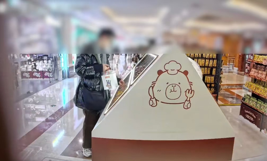 经了解,该店铺为吸引客流,将一款热门“卡皮巴拉”萌粒公仔装入透明亚克力展示柜,放置在店门口的商场公共通道处,并悬挂“如需购买公仔自行拿至店内结账”的告示牌。店家本想通过这种开放式展示模式吸引顾客,却没想到给了不法分子可乘之机。